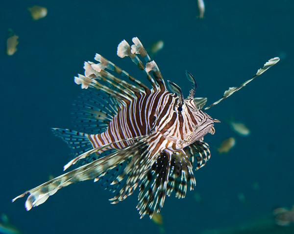 The lionfish is elegant, majestic, and invasive! Lionfish live in balance with nature in the coral reefs of the Indo –Pacific and are a prize subject for photographers. Lionfish have venomous spines – their zebra like strips serve as a warning to predators to stay away and avoid contact. Contact with their venomous spines cause extreme pain to humans.
