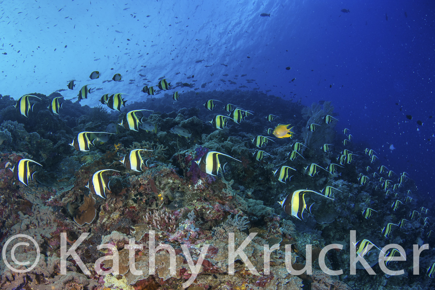 During the months of February and March, huge schools of Moorish idols engage in spawning aggregations of schooling Moorish idols. We saw this huge school as we emerged from the Blue Hole. On just about every dive, very active and healthy sea turtles roamed and swam freely in the Palauan waters along with schools of jacks, snappers, butterfly fish, and angelfish. Huge tridacna giant clams were abundant as well as tiny critters for macro hunting, such as gobies on whip coral And cleaning stations were everywhere.