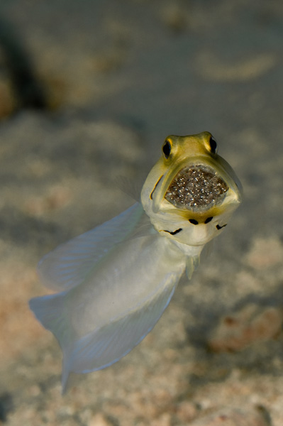 The Yellowhead jawfish (Opistognathus aurifrons) is a mouthbrooder – a paternal mouthbrooder. The male Yellowhead jawfish incubates his offspring’s eggs in his mouth until the eggs hatch and the juveniles are large enough to free swim. Jawfish burrow holes in sandy and rubbled areas and make their homes by excavating sand and rubble with their mouth. If you are patient and very still, you will see them stick their heads out of their burrow and swim up vertically and hover above their sandy home. The Yellowhead is found throughout the Caribbean in shallow waters. They are pale in color with a yellow head – hence their name: the Yellowhead! It was a thrill to finally see a male Yellowhead with his eggs in Little Cayman on Three Fathom Wall. It would be fun to observe the Yellowhead with his eggs over a period of days and see the actual release of the juveniles.